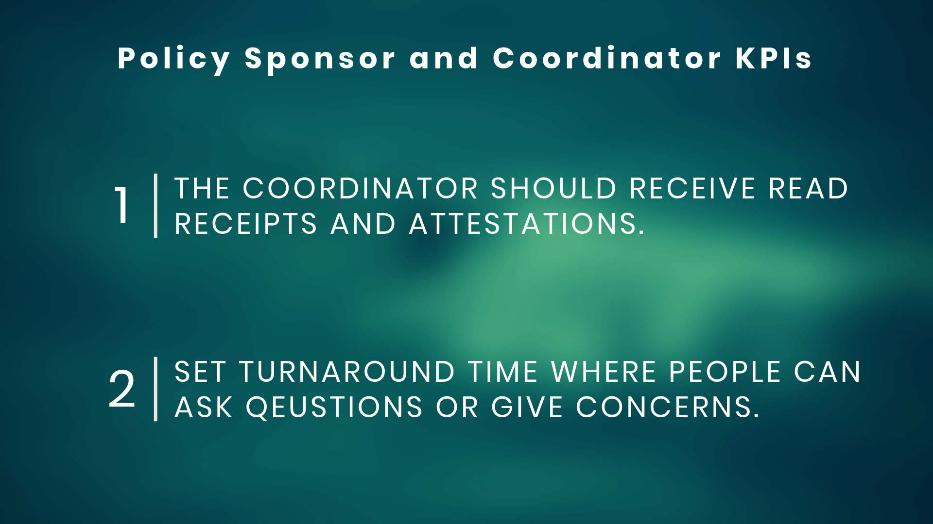 It’s a good idea to make sure that their employees, authors, and anyone in the organization has some sort of line of communication to give feedback. Once a policy is published, the sponsors should be notified that someone might call them with a question, a concern about what’s written, or give feedback to an appropriate contact.